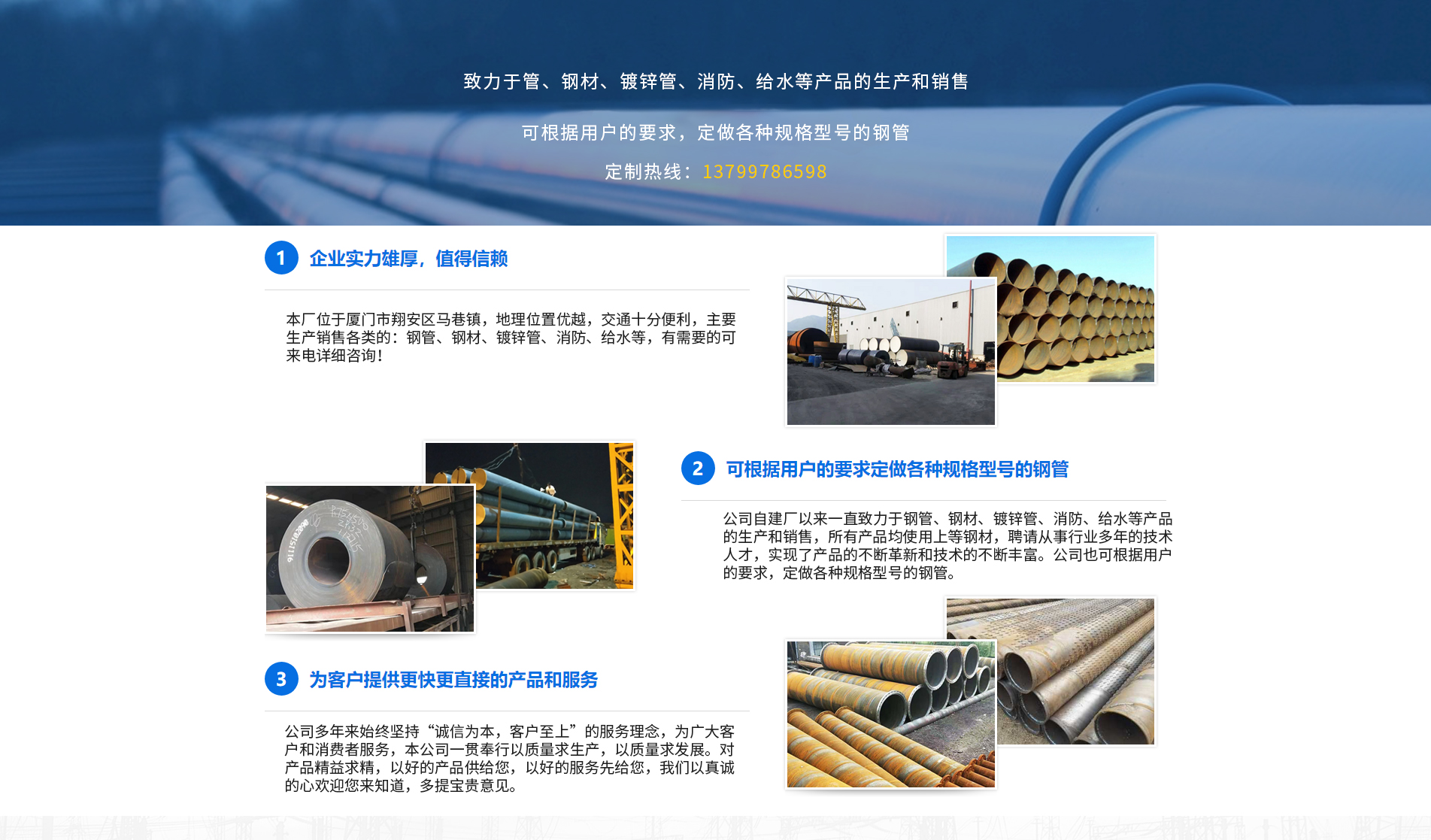廈門(mén)方圓澤金屬材料有限公司主要生產(chǎn)銷(xiāo)售各類(lèi)銀澤的:鋼管、鋼材、鍍鋅管、消防、給水等,產(chǎn)品被廣泛應(yīng)用于天然氣、石油、化工、電力、熱力管網(wǎng)、水源等長(zhǎng)距離輸送管道等,公司建立起了產(chǎn)品售前、售后服務(wù)規(guī)范,全過(guò)程滿(mǎn)足顧客要求,使我們的產(chǎn)品和服務(wù)深得顧客的信賴(lài),與顧客建立起了長(zhǎng)期合作互利關(guān)系。